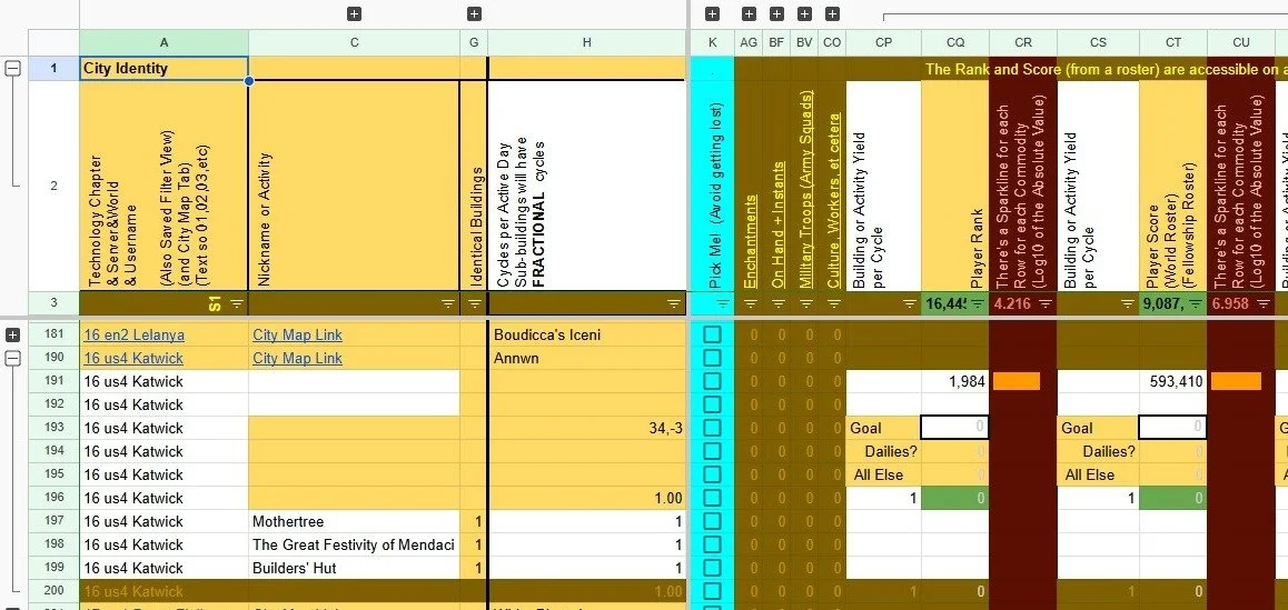 The first row of each stacked city includes a link to the Saved Filter View for that particular city, which is a shard with a preset sort and filter wherein you can sort and filter various rows without disturbing other players. As a bit of an aside, there are no indicators associated with the inherited (preset) sort order, which is why we’ve provided three different sortation macros. There’s also a link to the related City Map (and back again) and the Player’s Fellowship is indicated.